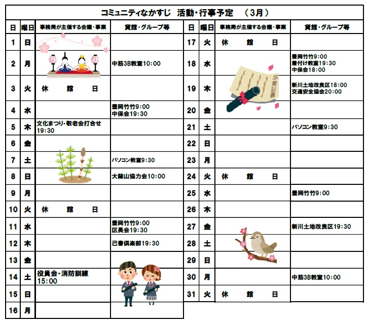 | ※平成29年4月1日より公民館からコミュニティセンターへ移行の為、コミュニティセンターの使用受付はコミュニティセンターですが、使用管理が豊岡市役所と変更になります。 今までと若干申込方法・使用方法が変更となりますが、ご理解をお願いします。 尚、不明な点は、上記連絡先(中筋地区コミュニティセンター)へお問い合わせください。 |